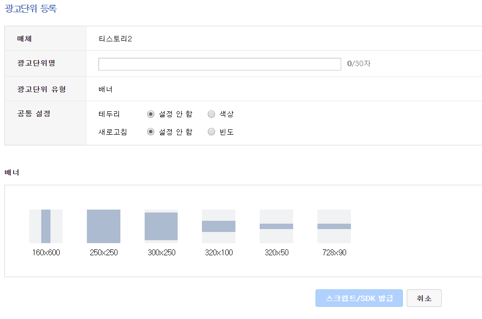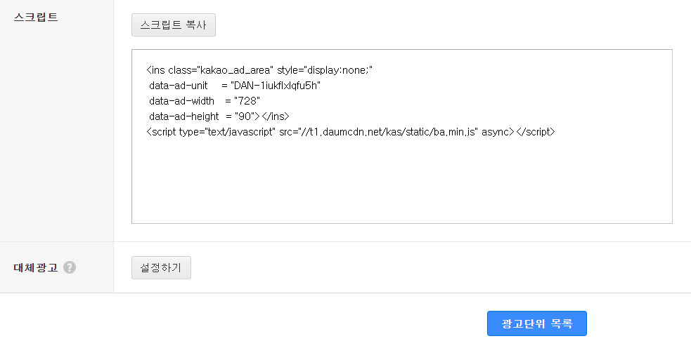 광고 단위명을 설정 -> 728x90을 클릭 -> 스크립트/SDK 발급 클릭