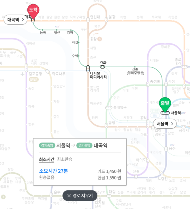 예를 들어 서울역 -> 대곡역을 예시를 들어보겠다. 시간에 가격까지 나오기 때문에 쉽게 알아볼 수 있다.