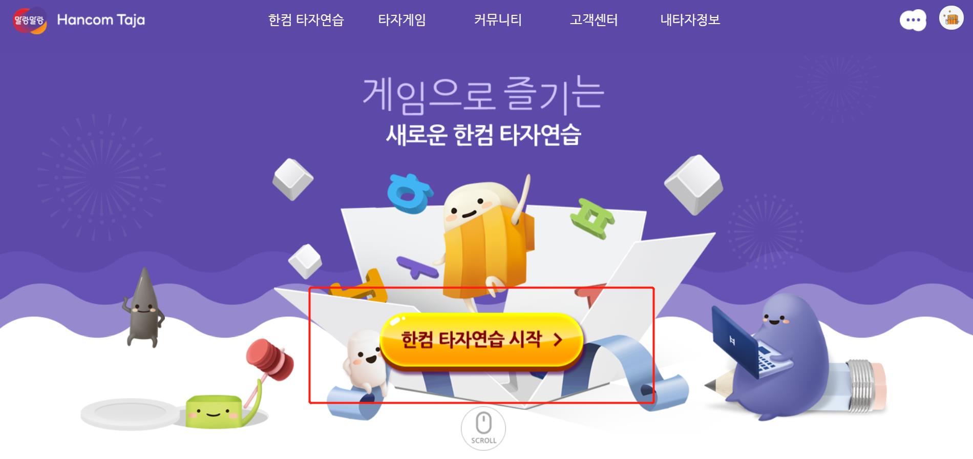 한컴타자연습 시작을 클릭하면 "게임으로 즐기는 새로운 한컴타자연습"이라는 화면이 나올 겁니다. 그럼 화면을 클릭을 하시면 한컴타자 연습으로 넘어가게 됩니다.