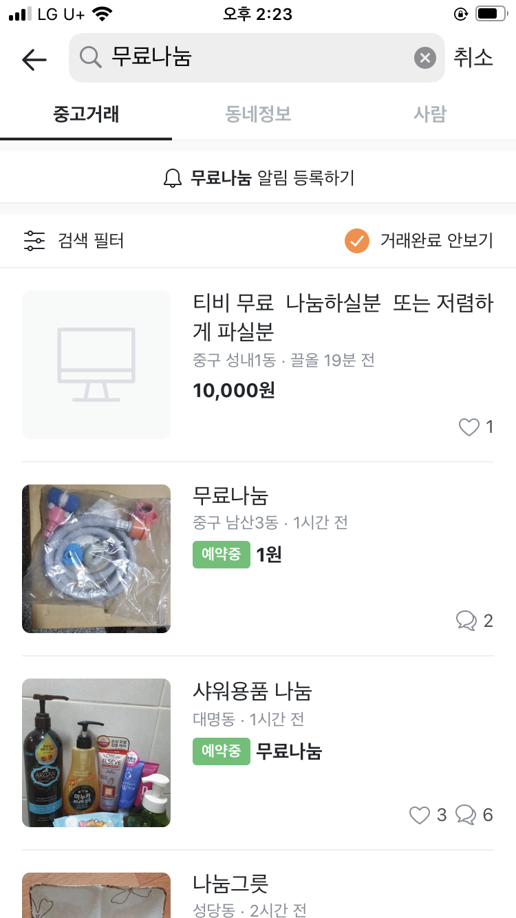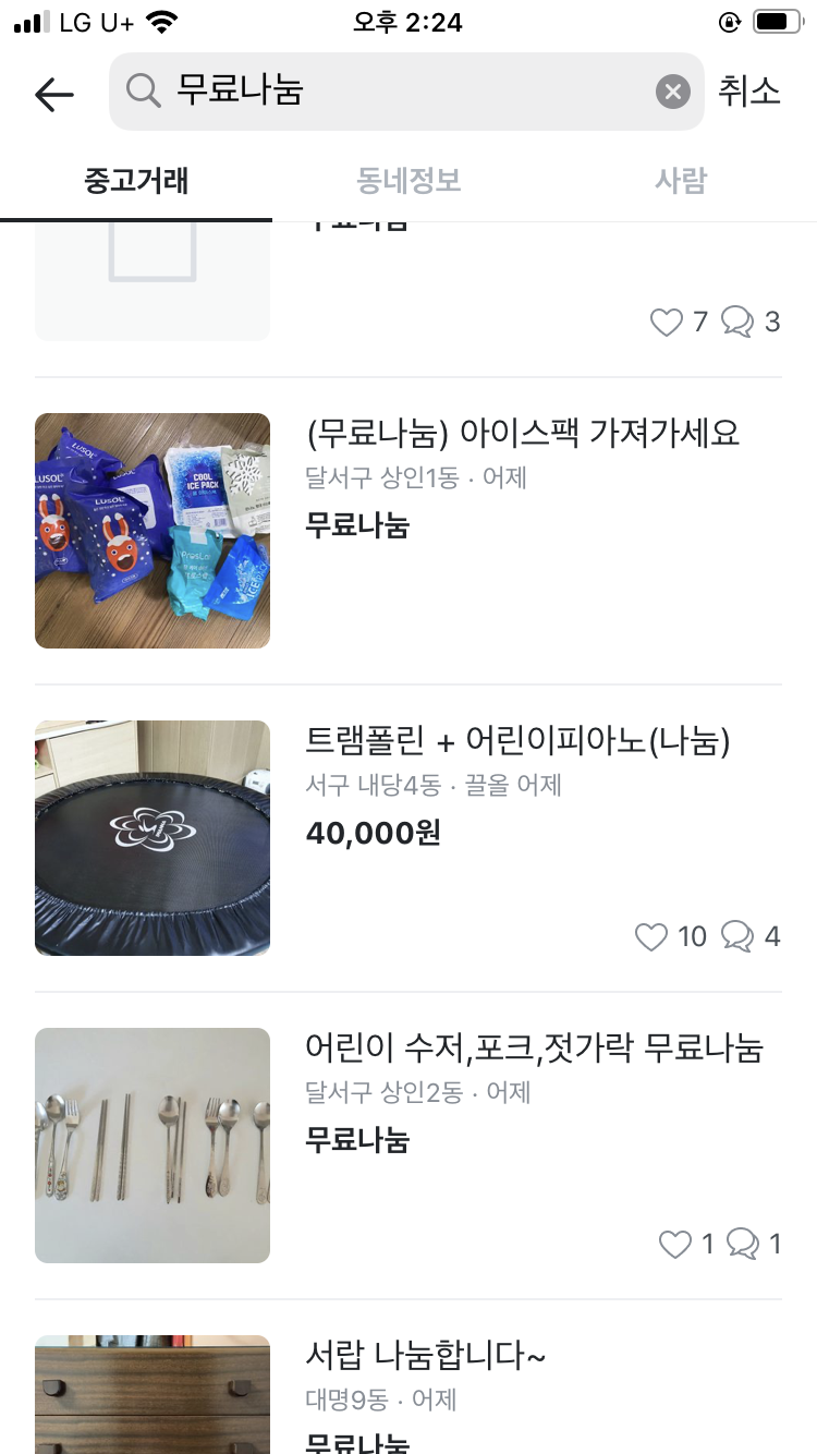 당근마켓은 실제 집 근처에 물품들을 보여주기 때문에 쉽게 직거래를 할 수 있습니다. 그렇기에 무료로 나눠주는 좋은 이웃들도 자주 찾아볼 수 있는데요. 검색창에 "무료 나눔"이라고 검색하면 의외로 좋은 물건들을 나눔 하시는 분들이 많습니다. 저도 가끔 무료 나눔을 받으면 죄송해서 거래를 하러 갈 때 음료수라도 하나 사서 가는데요. 동네분들과 서로 정답게 인사도 하며 아직 세상은 살만하다고 느끼기도 한답니다.