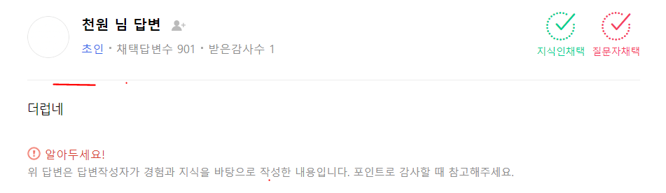 답변자는 천원 님으로 그날 당일에 채택이 되었다.