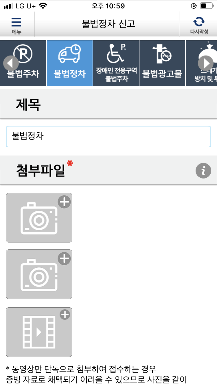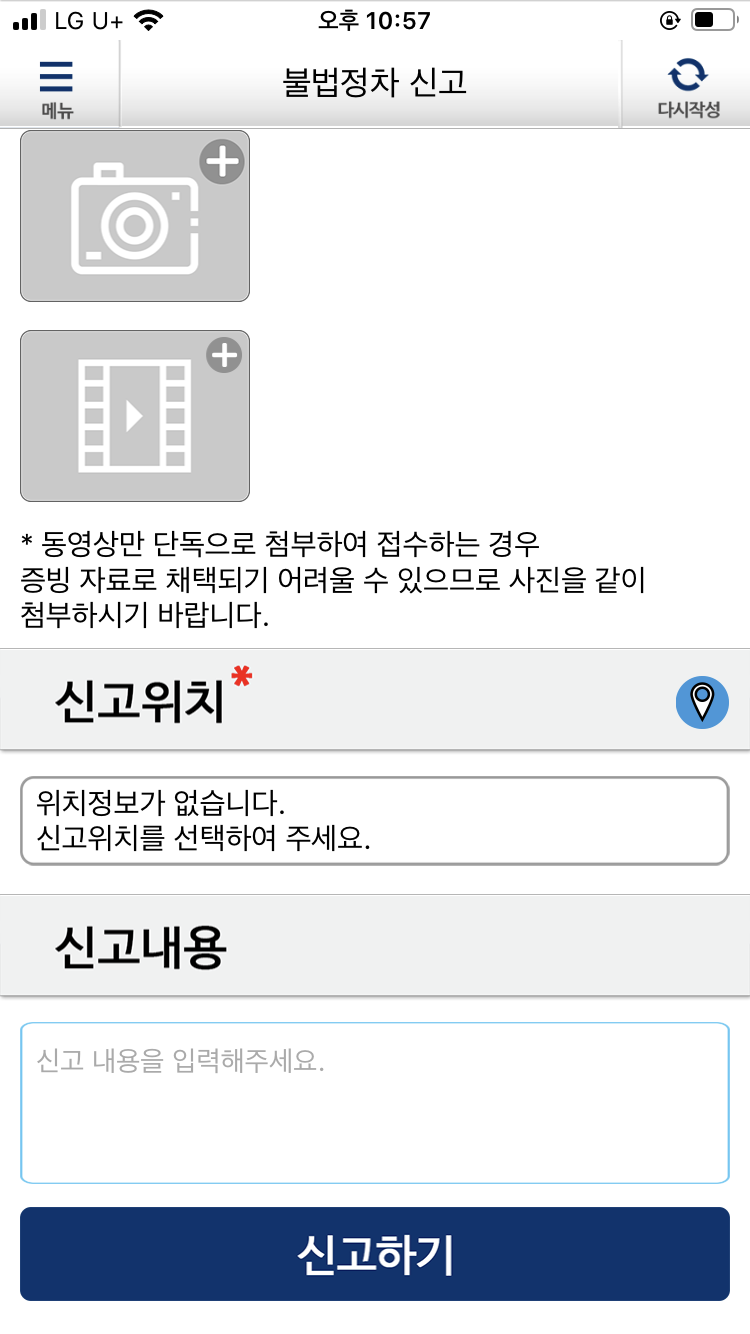 ※ 신고 시 - 동영상만 단독으로 첨부하여 접수하는 경우 증빙 자룔 채택되기 어려울 수 있으므로 사진을 같이 첨부하시길 바랍니다.
