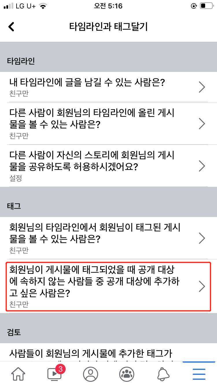 5) 태그 설정 "회원님이 게시물에 태그되었을 때 공개 대상에 속하지 않는 사람들 중 공개 대상에 추가하고 싶은 사람은?"을 클릭