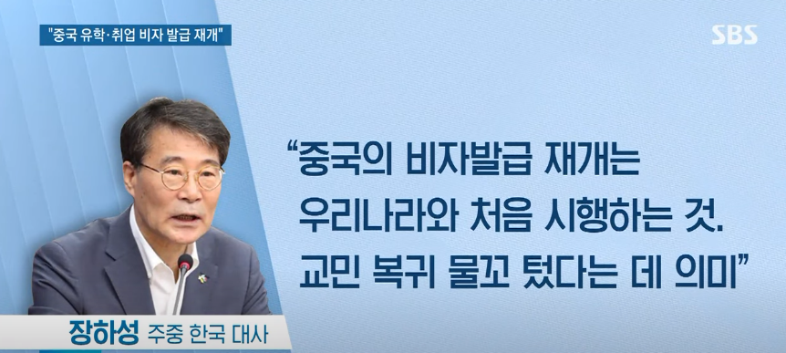 장하성 주중 한국 대사는 27일 베이징 특파원들과의 간담회에서 "중국이 1. 유학생 2. 취업자 3. 유효한 거류증이 있는 교민 등 3그룹에 한하여 비자 발급에 합의했다"라고 말했다고 말했습니다.