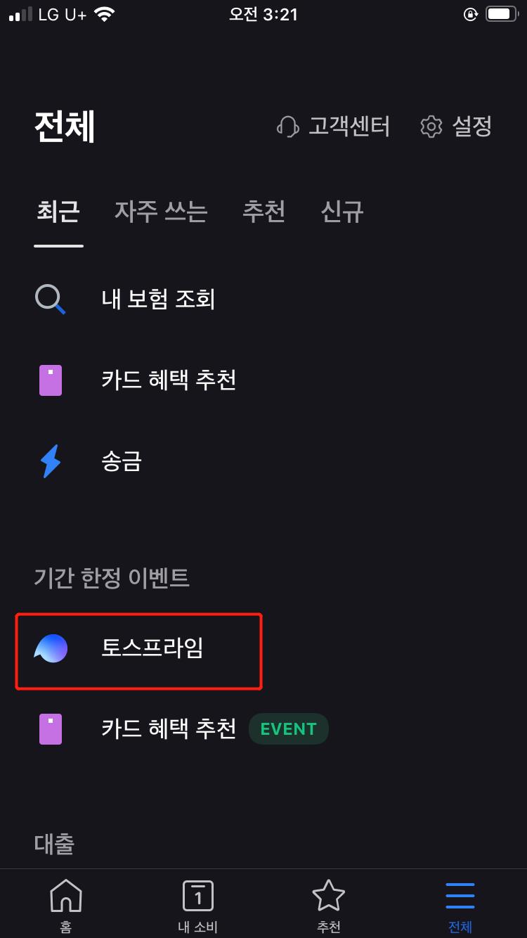 토스 프라임은 토스 앱에서 삼지창을 클릭 후 토스 프라임을 클릭하시면 쉽게 가입하실 수 있습니다. 한 달간은 무료이니 한달 사용해보고 별로면 해제하시면 됩니다.