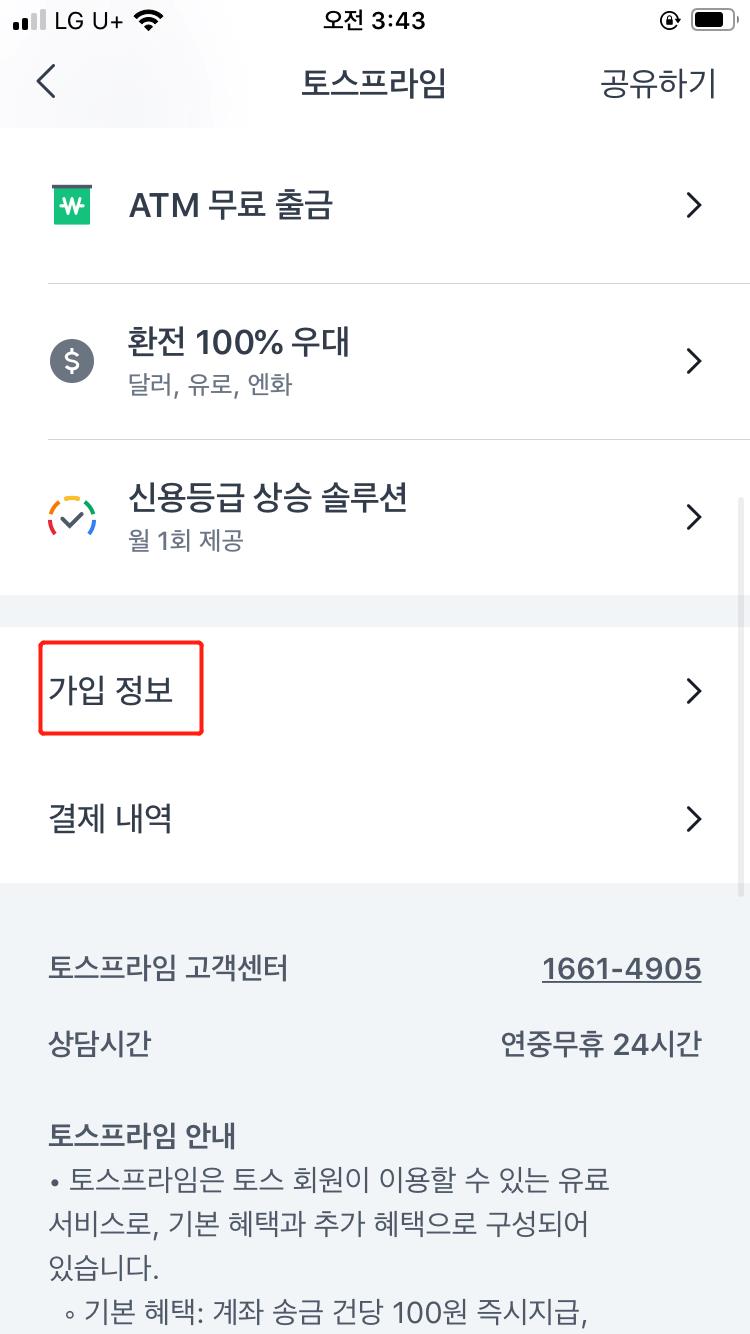 삼지창을 클릭 -> 토스프라임 클릭 -> 가입정보 클릭 -> 토스프라임 혜택 포기하기 클릭