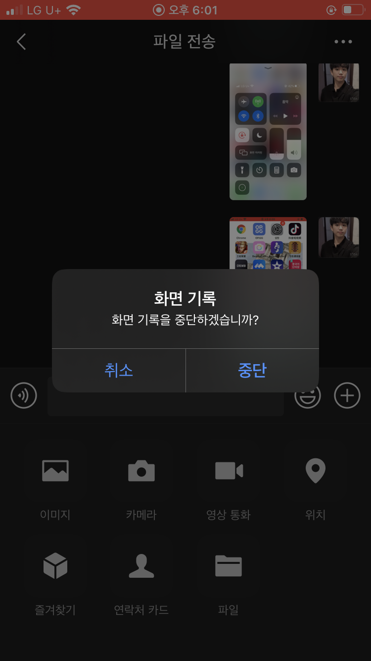 그러면 이렇게 취소와 중단 버튼이 나오는데 중단 버튼을 클릭하면 자동으로 갤러리에 저장된다.