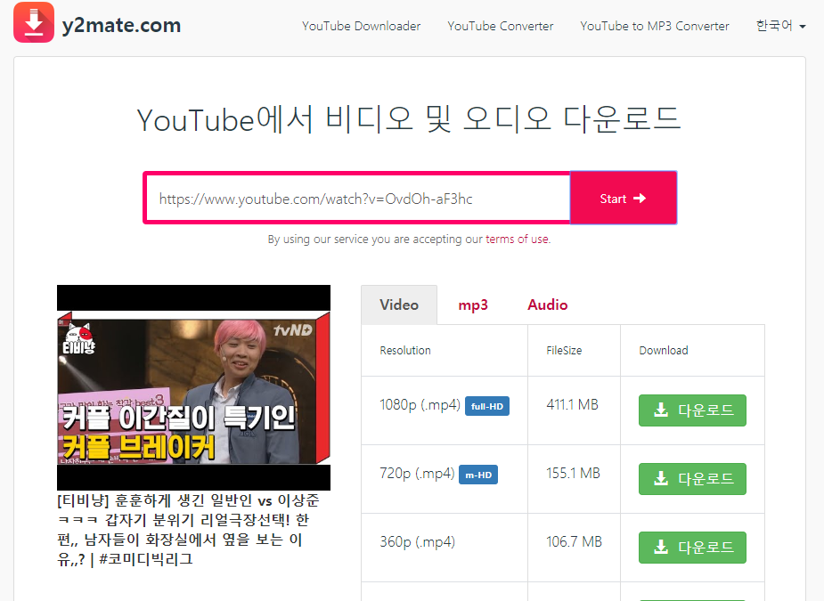 다운로드하고 싶은 유튜브에 들어가서 주소를 복사 후 y 2 mate에 붙여 넣기를 한 후 시작 버튼을 클릭해주시기만 하면 됩니다.