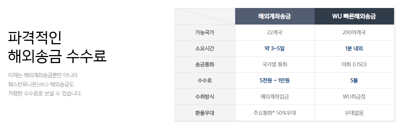 보기에는 빠른 해외송금이 더 좋은 것 같지만 해외계좌 송금 은은 주요 통화 환율우대가 있고 빠른 해외송금은 우대가 없다.