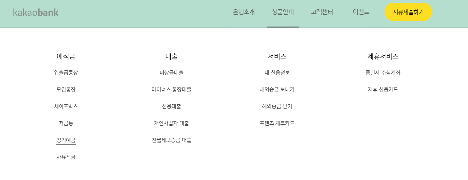 카카오뱅크 pc 홈페이지에 들어가게 되면 많은 상품들이 나열이 되어있습니다.