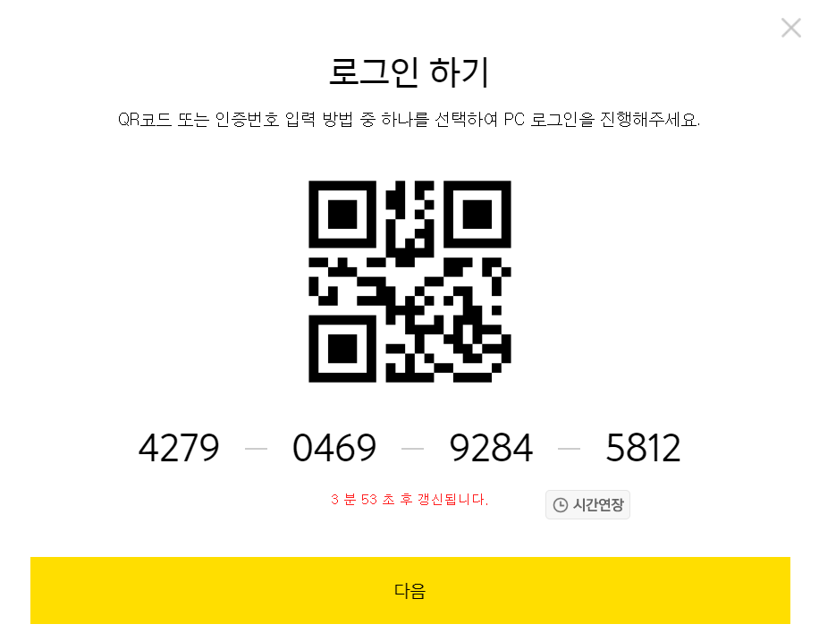 1- 오른쪽 하단의... 을 클릭 2. 오른쪽 상단의 큐알코드 버튼을 클릭 3. 컴퓨터의 큐알코드를 스캔하면 끝.