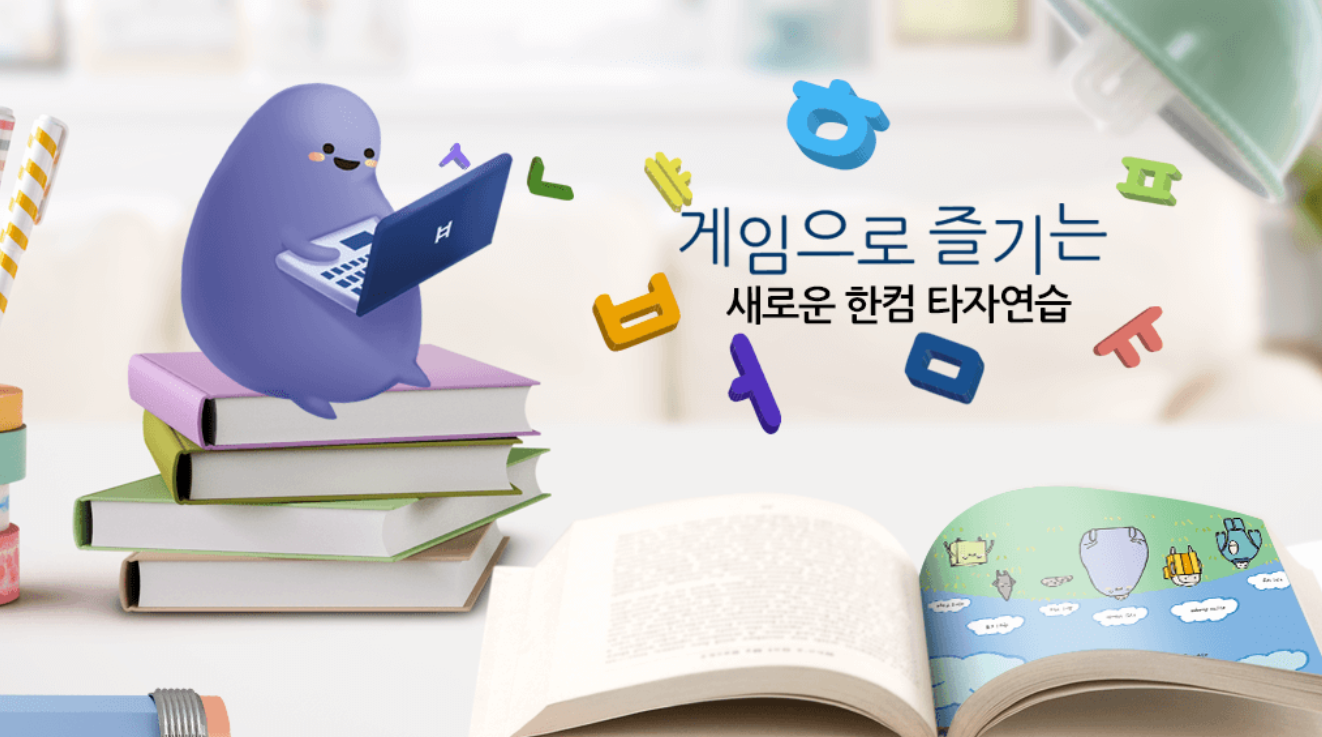 한컴타자연습 시작을 클릭하면 "게임으로 즐기는 새로운 한컴타자연습"이라는 화면이 나올 겁니다. 그럼 화면을 클릭을 하시면 한컴타자 연습으로 넘어가게 됩니다.