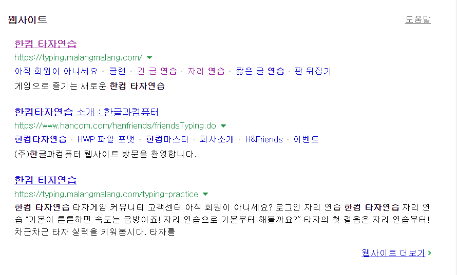 네이버나 다음 모두 한컴타자 연습을 검색하시면 웹사이트 부분과 가장 상단 부분에 한컴 타자연습 웹사이트가 존재합니다. 이곳으로 들어가시면 다시 제 블로그를 방문할 필요 없이 바로 한컴타자연습 홈페이지 롤 들어가실 수 있습니다.