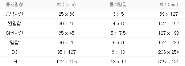 나머지 두개는 출판인쇄용과 사진인화용이 있는데. 이 두개는 일반인에게는 잘 사용되지 않음으로 넘어가도록 하겠습니다. 하지만 구격이 필요하신분이 있을 수도 있기 때문에 사진으로 규격을 남겨드리니 필요하시다면 찾아보시길 바랍니다.