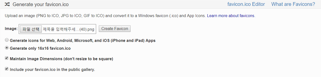 저와 같이 Generate only 16x16 favicon.ico를 클릭하신 후