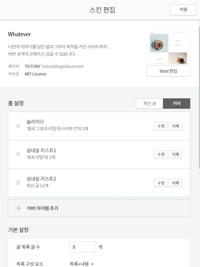 블로그 관리자 페이지 - 꾸미기 - 스킨 변경 - Whatever 스킨을 선택해주세요