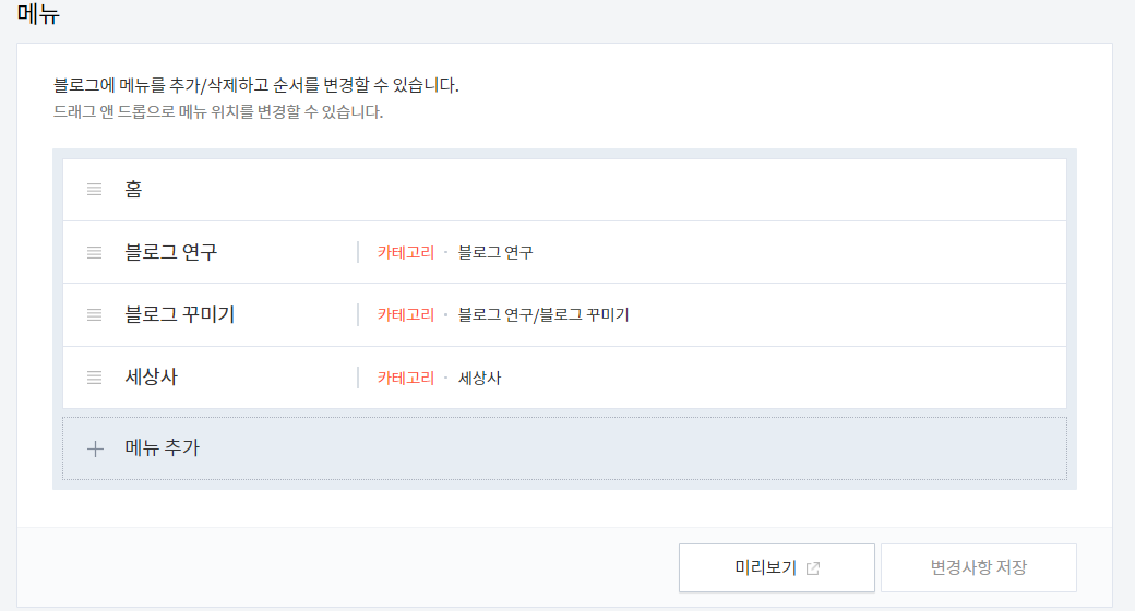 블로그 관리자 페이지 - 꾸미기 - 메뉴에 들어가셔서