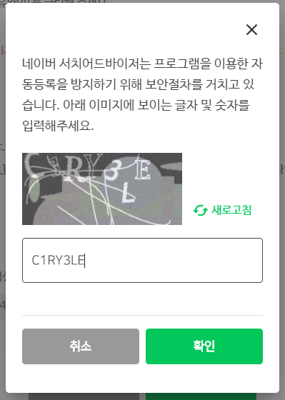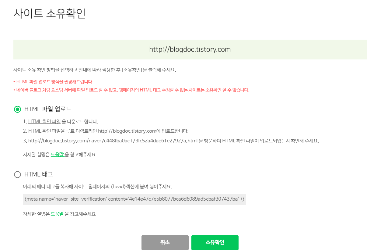 메타 태그 입력 후 확인을 누른 후 보안키를 작성하면 소유확인이 끝납니다