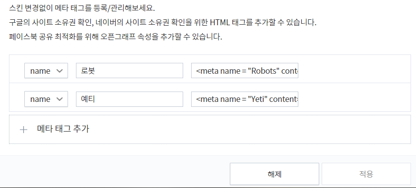 클릭을 하면 아래와 같은 화면이 나오는데 "메타 태크 추가"를 클릭해서