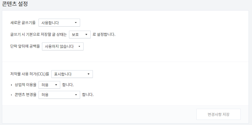자신의 블로그 관리자 페이지 -> 콘텐츠 -> 설정 클릭