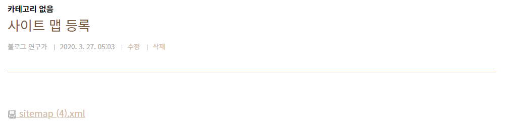 사이트 맵을 만드는 데는 글의 양에 따라 걸리는 시간이 다른데 초보자 분들은 글이 몇 개 없어서 5~10분 정도면 될 거라 예상합니다