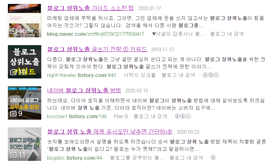 비록 4번째 칸에 겨우 턱걸이로 상위노출을 하고 있는 실정인 "블로그 상위 노출" 키워드이지만 상위노출되어 있는 블로그들은 모두 앞쪽에 배치되어 있는 것을 알 수 있다